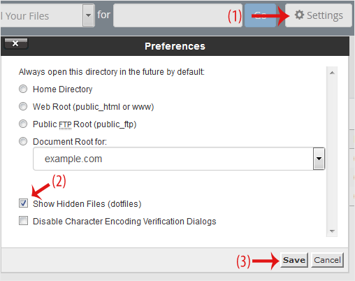 4. If the dot htaccess file does not show, click on Settings in the File Manager. You can find the Settings button on the right side of the top menu. Mark the Show Hidden Files (Dotfiles) option in the new window box and click on Save. Now, the dot htaccess file should be present. If it does not exist, create a new one.
