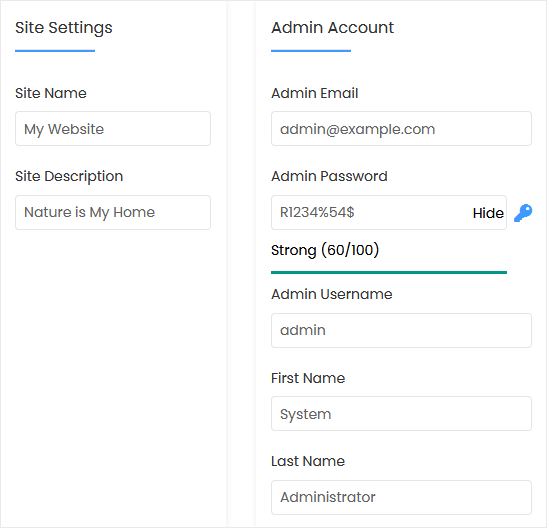 • Admin Username: Your new Dotclear username (for security reasons, do not use the administrator or the admin username).